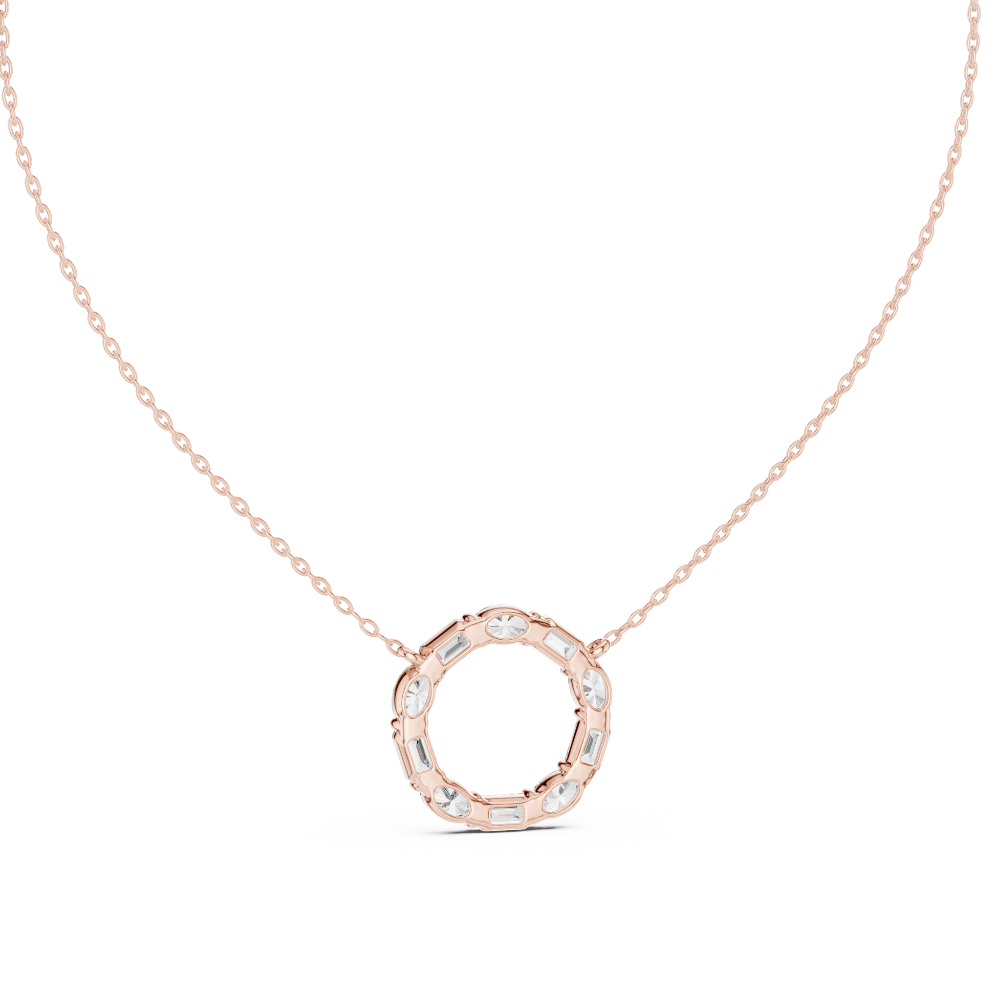 This sophisticated Diamond Circle Pendant Necklace features a graceful mix of oval-cut and emerald-cut lab-grown diamonds arranged in a continuous circular design. The contrasting shapes create visual depth and refined brilliance, symbolizing eternity, unity, and everlasting elegance. Suspended from a sleek chain, this pendant delivers timeless luxury with a modern geometric touch.