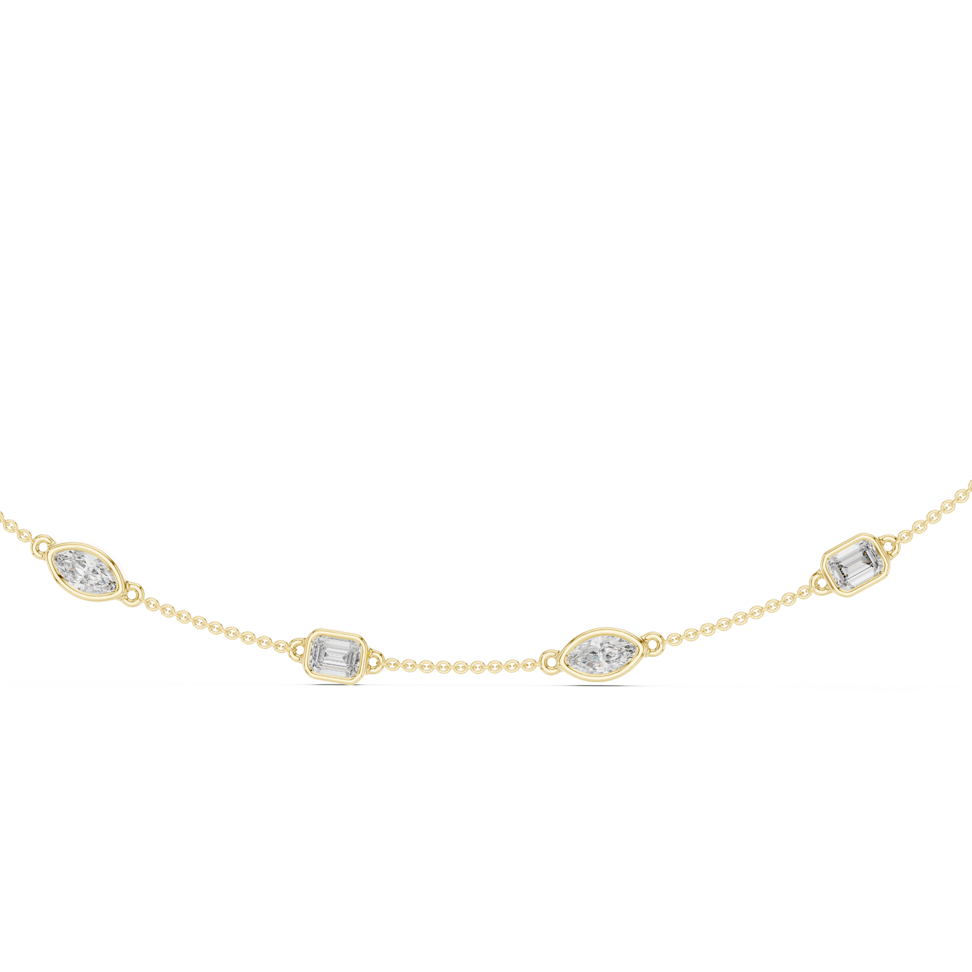 Effortlessly elegant with a contemporary edge, the Matisha Marquise & Emerald Lab-Grown Diamond Station Necklace features a refined sequence of marquise-cut and emerald-cut diamonds, delicately spaced along a polished chain. The contrasting shapes create a modern rhythm of sparkle and structure, offering a fashion-forward statement with timeless sophistication.