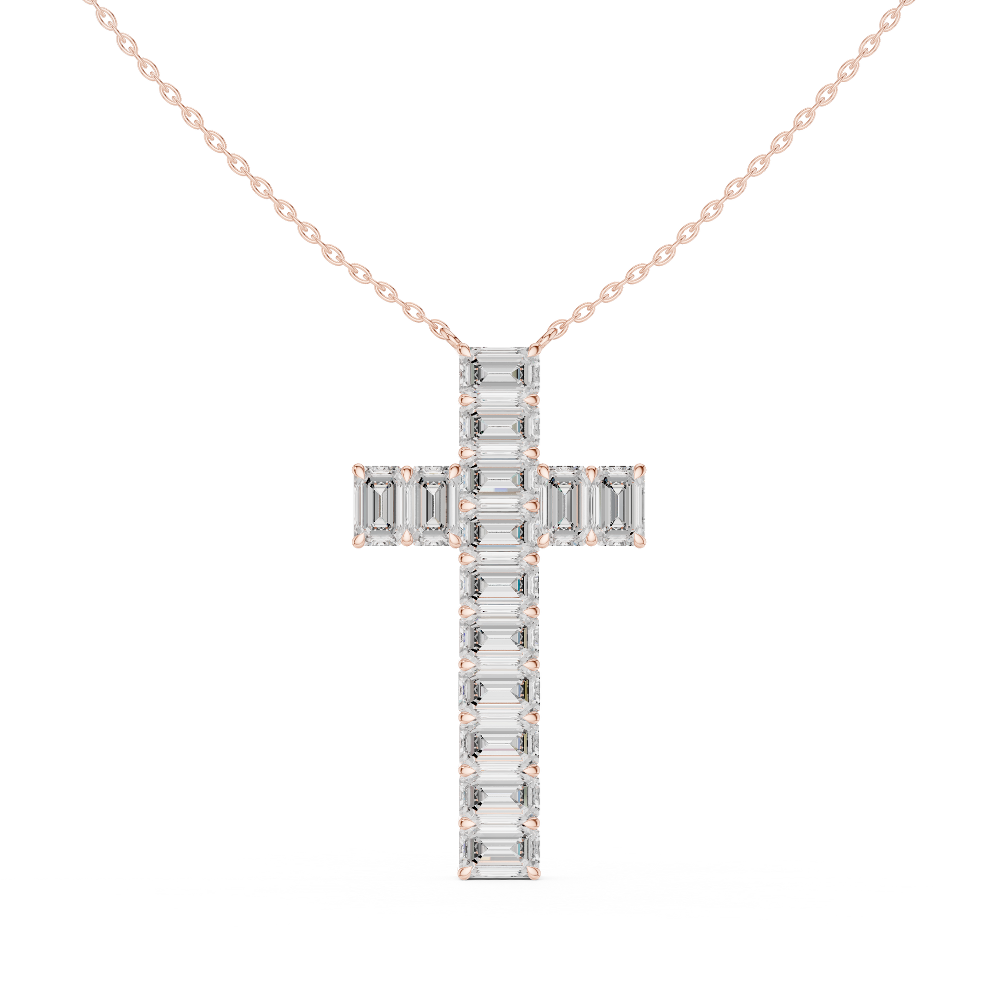 This elegant diamond cross pendant necklace features sleek baguette or emerald-cut diamonds arranged in a refined cross silhouette. The clean lines and step-cut diamonds create a bold yet timeless look, symbolizing faith, strength, and devotion with modern sophistication.