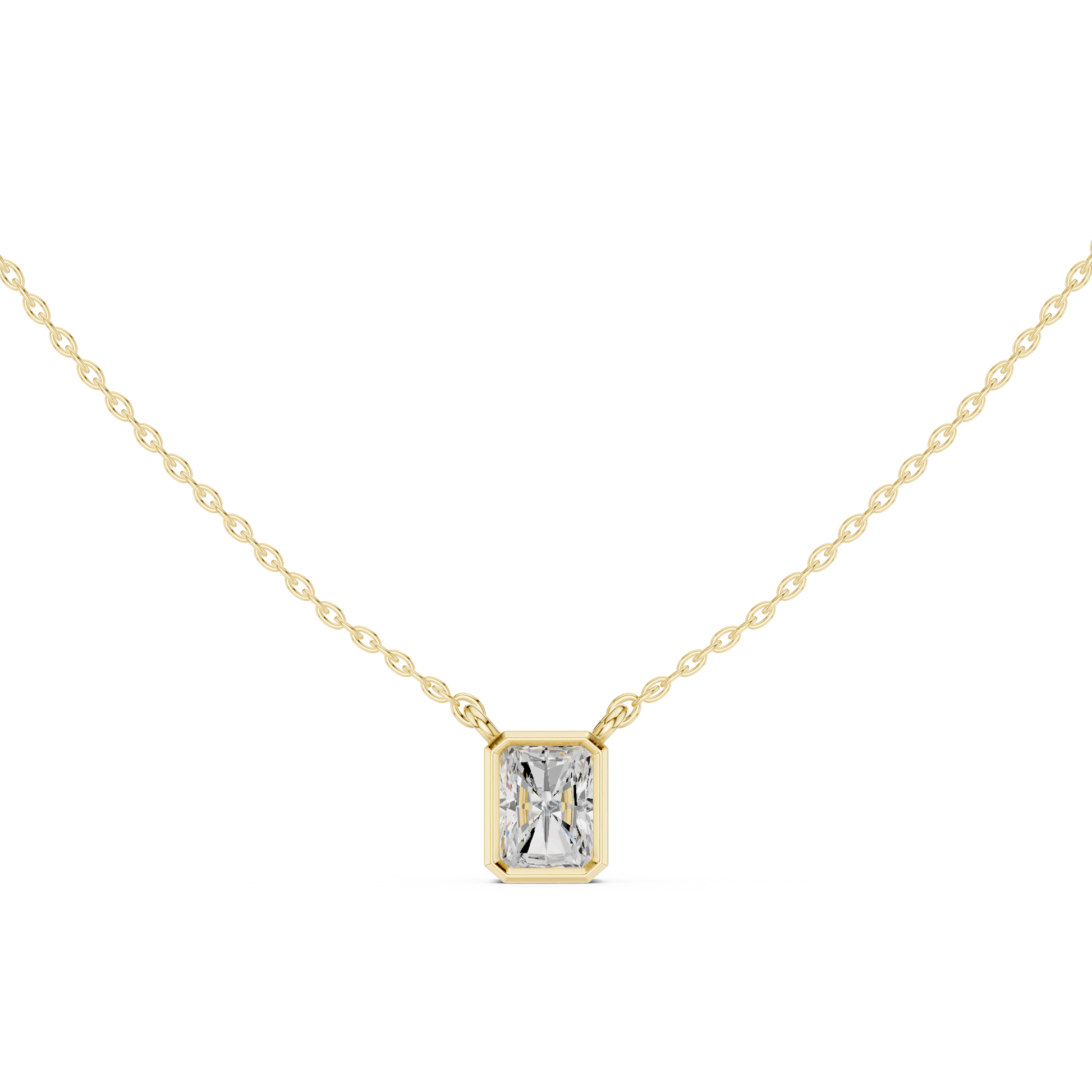 This elegant pendant features a radiant-cut lab-grown diamond securely set in a sleek bezel The unique radiant cut combines the elegance of an emerald shape with the brilliance of a round cut, creating a modern and sparkling look perfect for engagements, anniversaries, or as a timeless everyday accessory