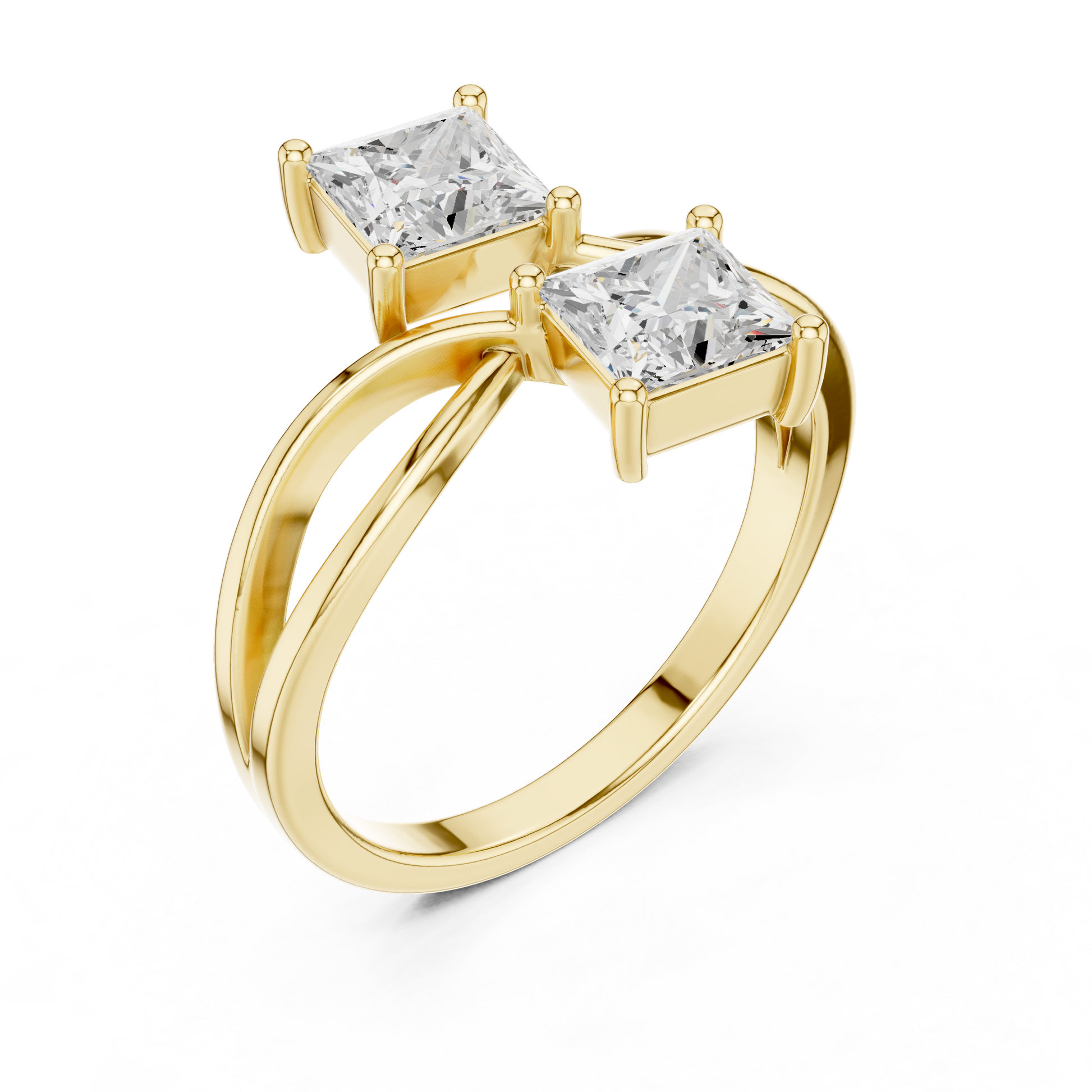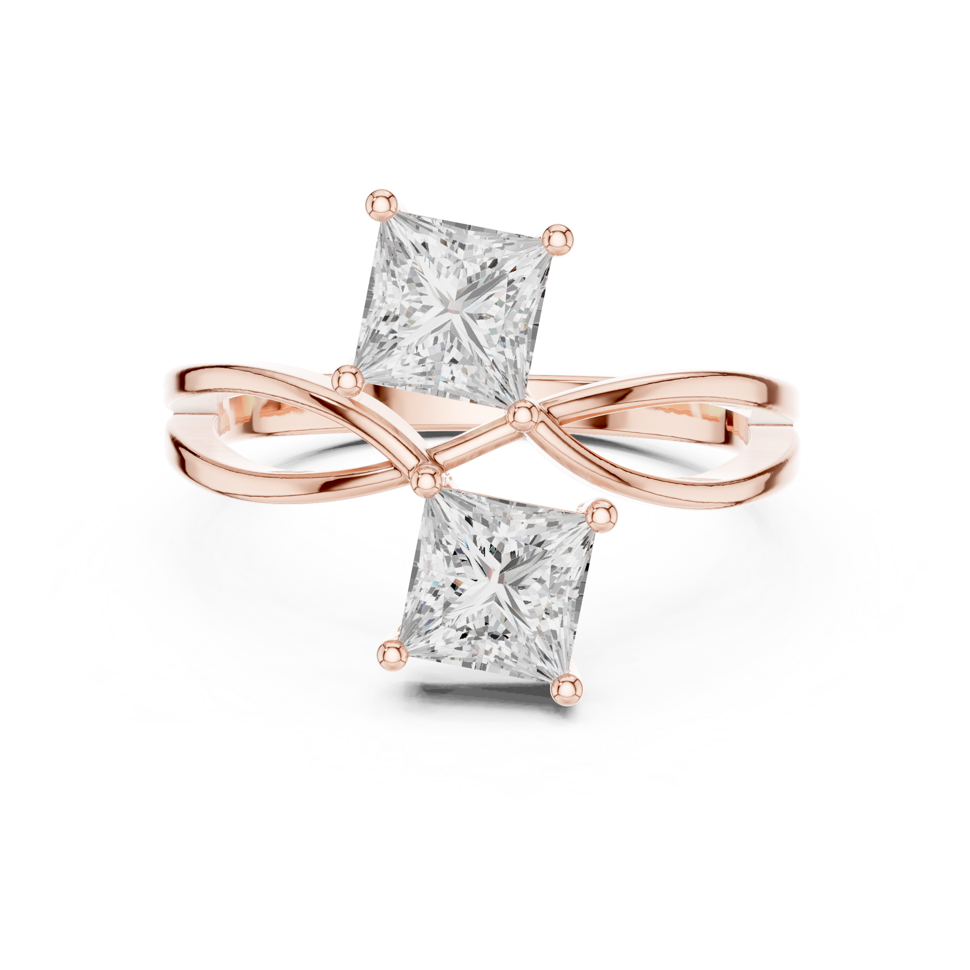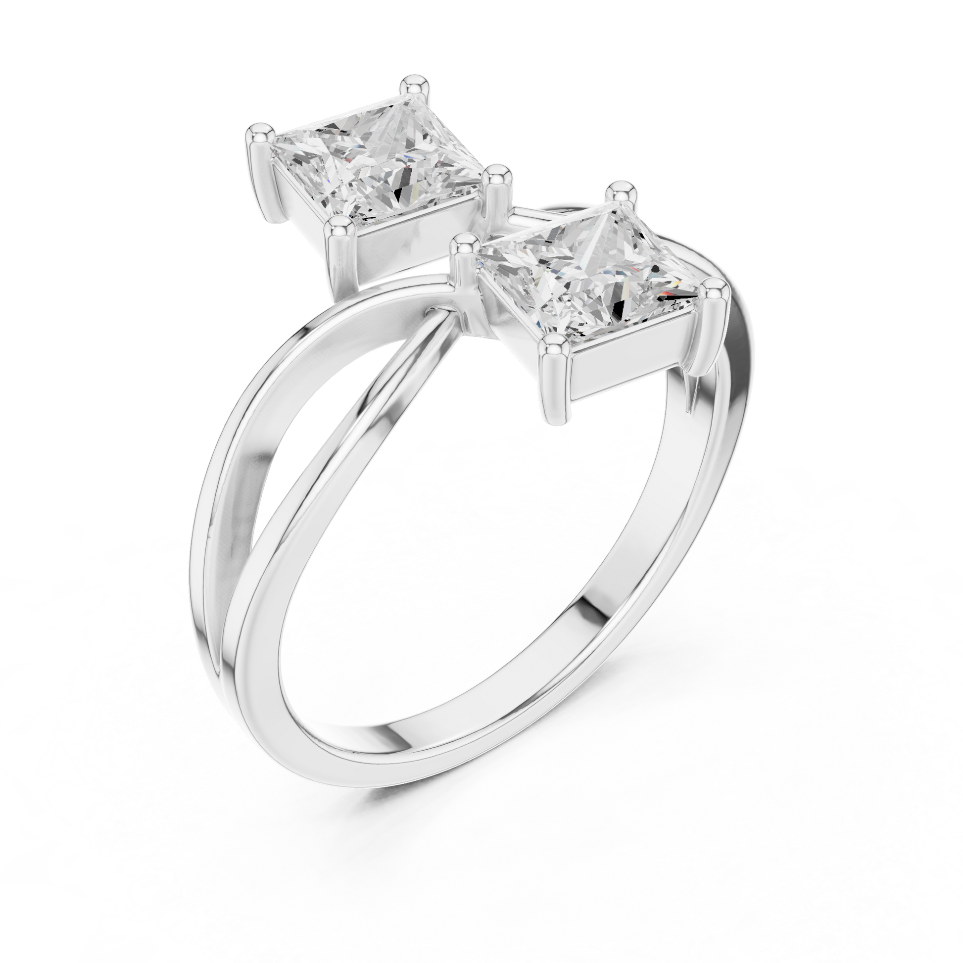 This elegant double engagement ring features two princess-cut moissanite stones set on a gracefully twisted or bypass-style band The modern design creates a unique intertwined look while the brilliant stones provide exceptional sparkle perfect for proposals, anniversaries, or milestone celebrations