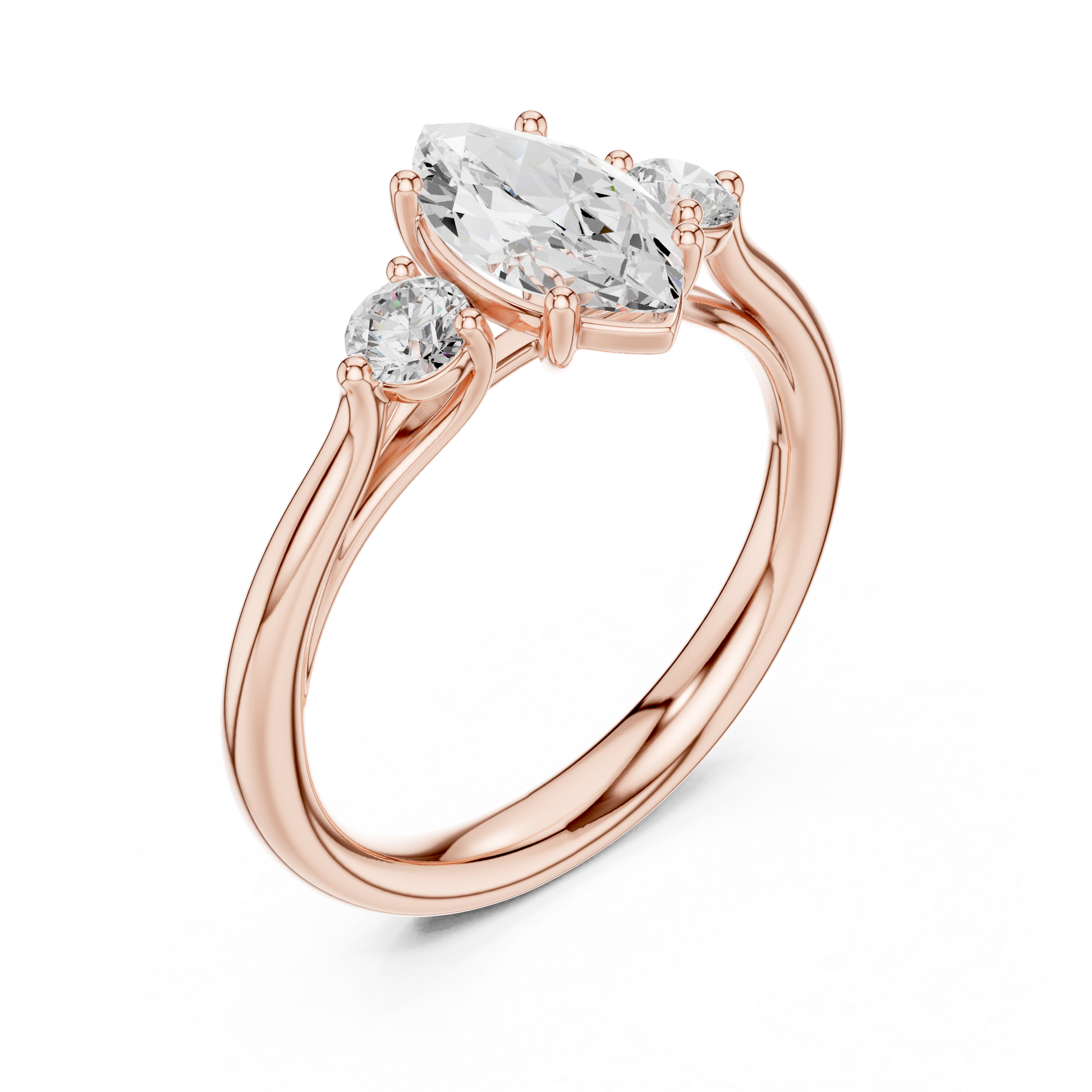This stunning engagement ring features a large elongated marquise-cut center diamond flanked by two smaller side stones that can be round or marquise-shaped The elegant three-stone design symbolizes past, present, and future while creating a striking, sophisticated look