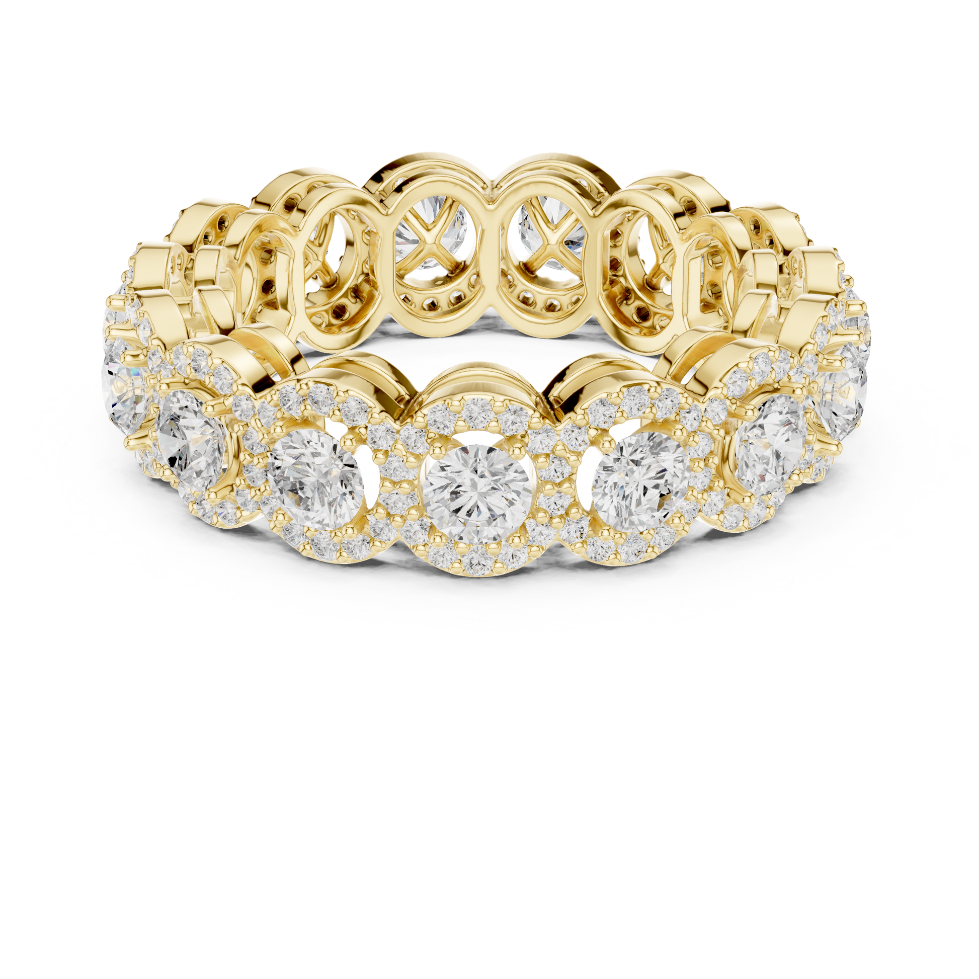 This elegant eternity ring features round diamonds framed in a delicate scalloped halo design creating continuous brilliance around the band The scalloped detailing enhances sparkle and adds a refined vintage-inspired touch while maintaining a timeless and luxurious look perfect for weddings anniversaries or stacking
