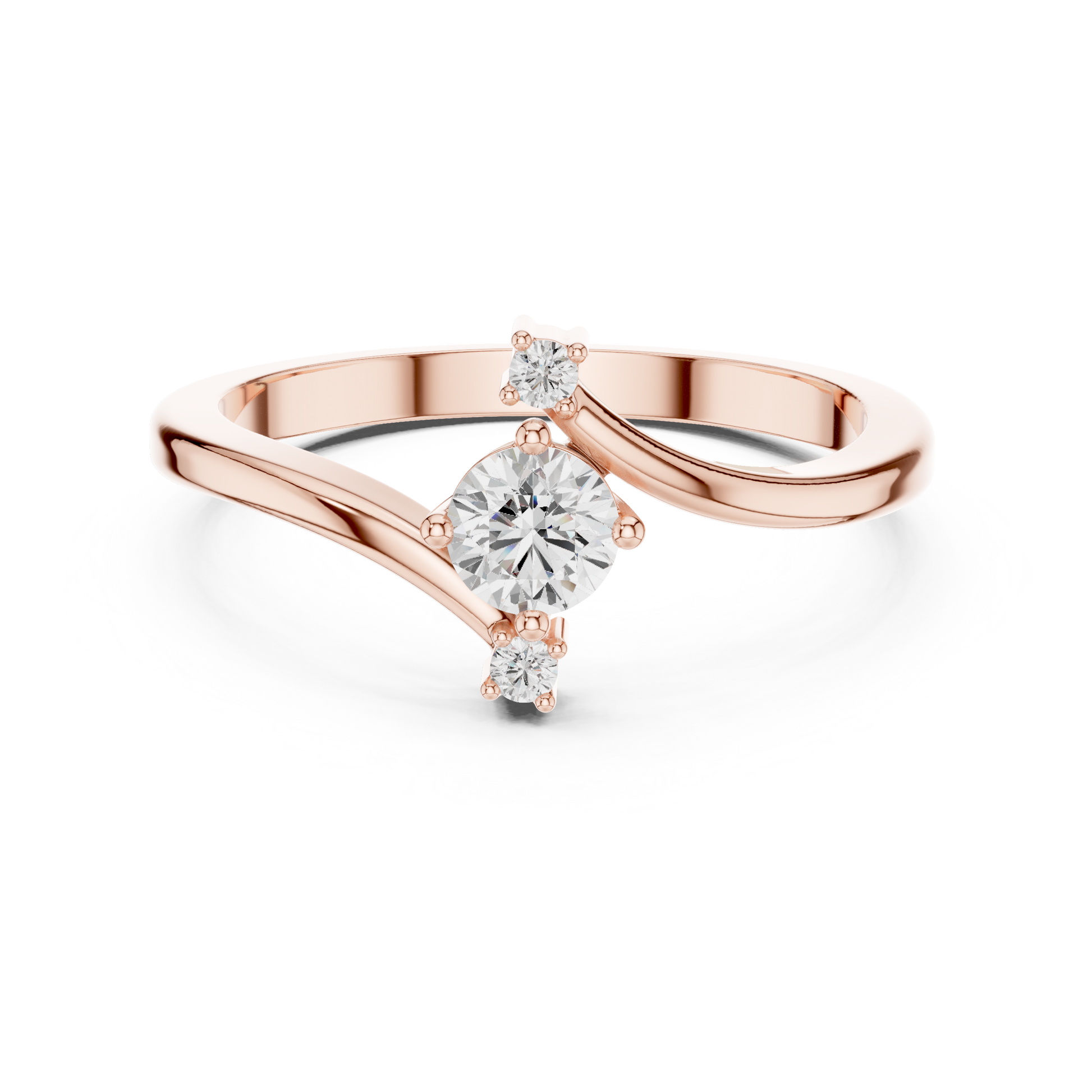 This elegant ring features a graceful bypass design combined with a three-stone setting symbolizing past present and future The flowing crossover band highlights three sparkling diamonds creating a balanced blend of modern style and timeless meaning perfect for engagements anniversaries or meaningful gifts
