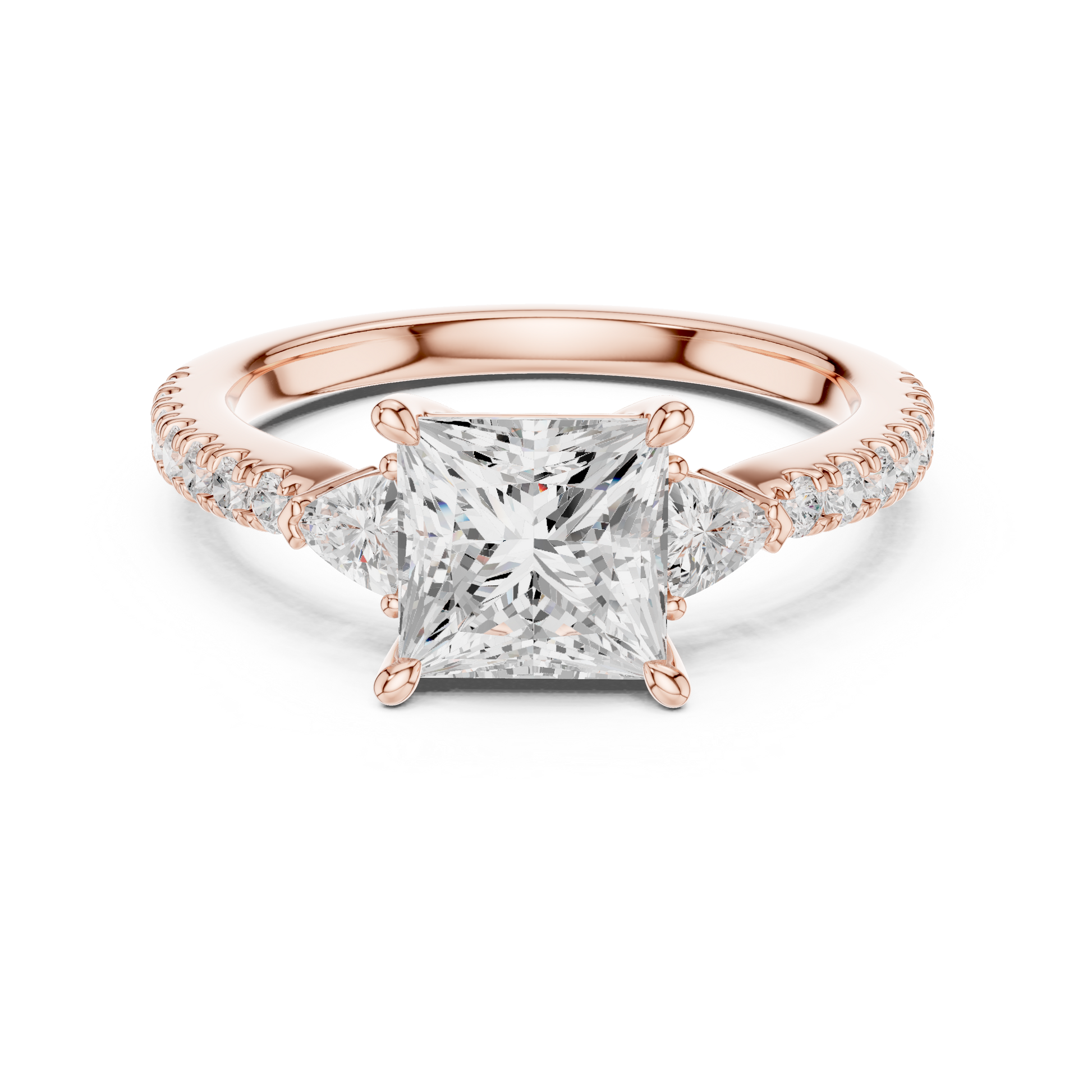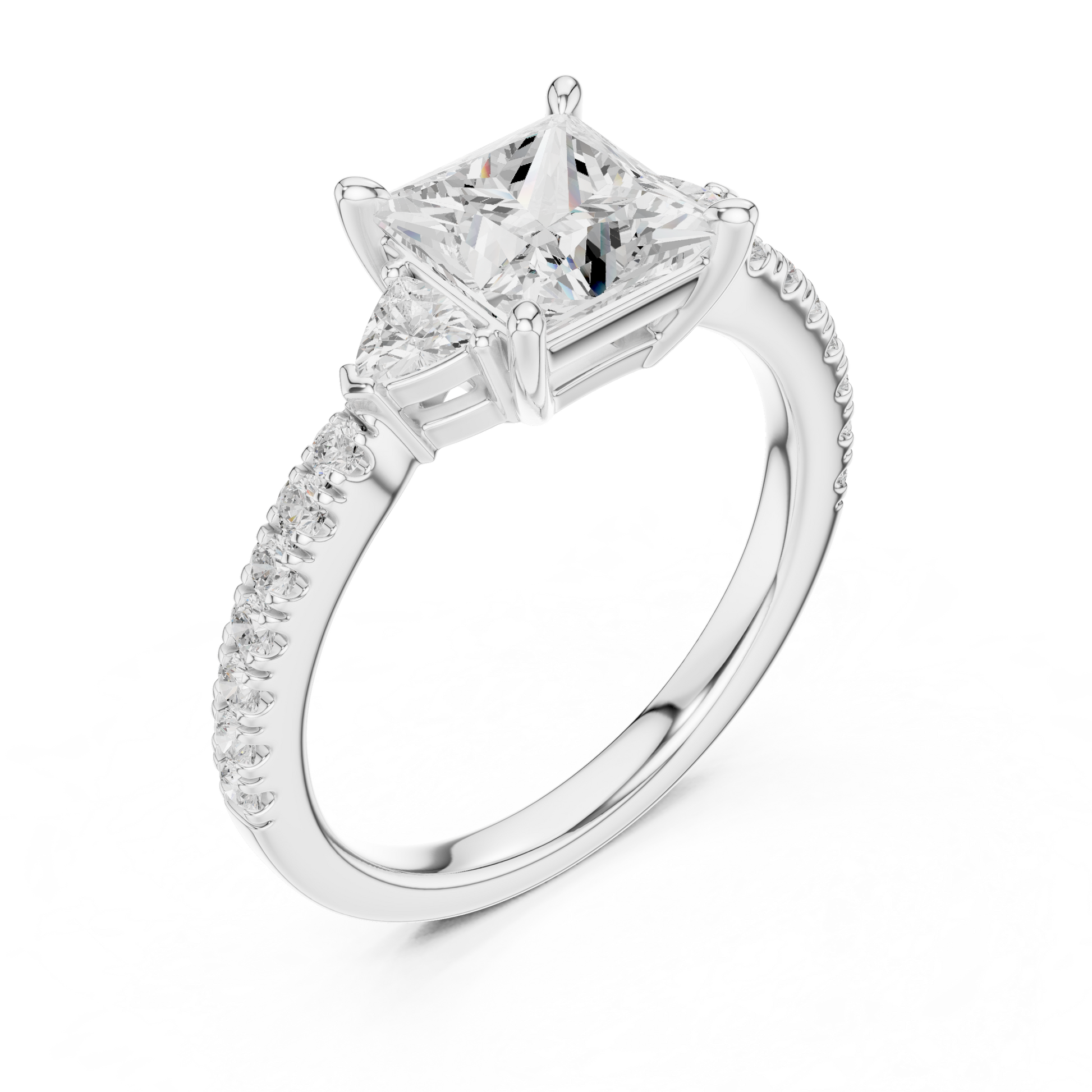 This stunning engagement ring features a princess-cut center diamond flanked by two brilliant trillion-cut side diamonds set on a sparkling pavé band The combination of geometric shapes and pavé accents creates a modern and sophisticated design perfect for proposals, weddings, or milestone gifts
