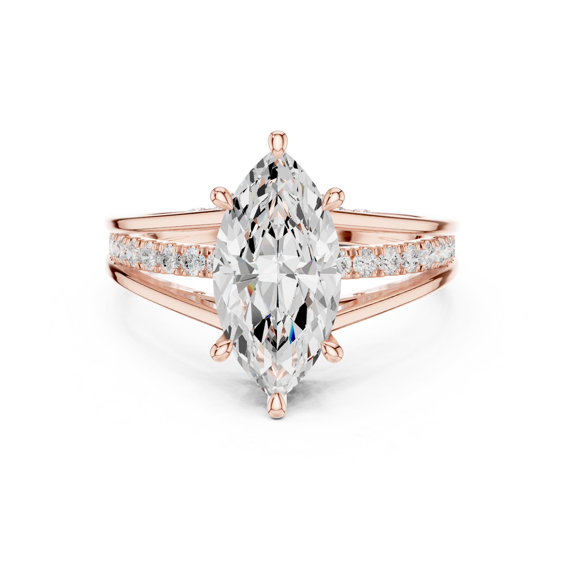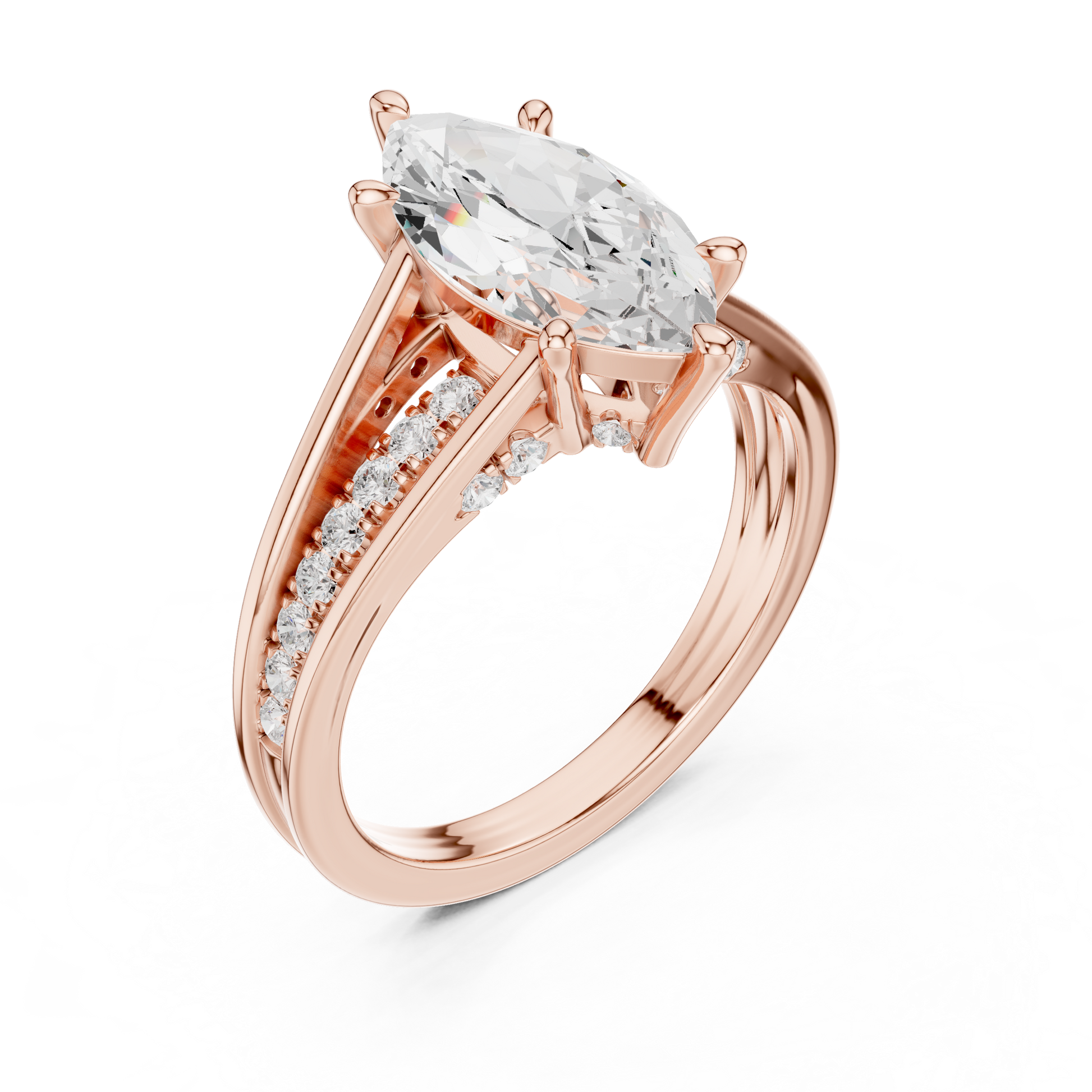 This stunning engagement ring features a brilliant marquise-cut diamond as the center stone Its elongated shape creates a flattering, elegant silhouette perfect for proposals, weddings, or milestone gifts