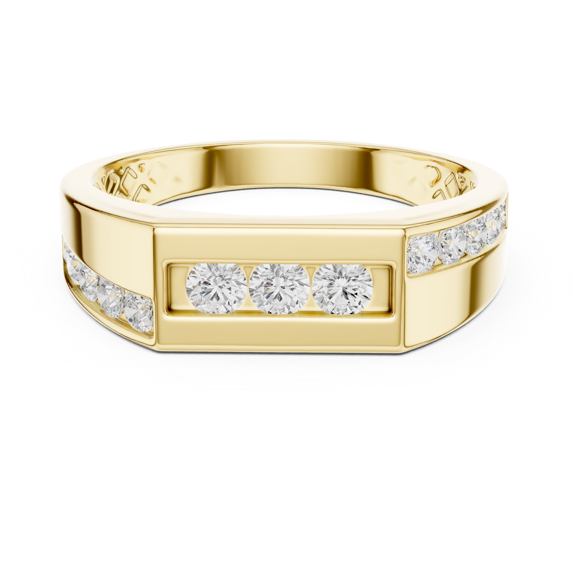 This refined men’s diamond ring features three round-cut diamonds set horizontally across the center complemented by channel-set accent diamonds along the shoulders The bold yet sophisticated design offers strong masculine appeal making it an excellent choice for an engagement ring wedding band or statement piece