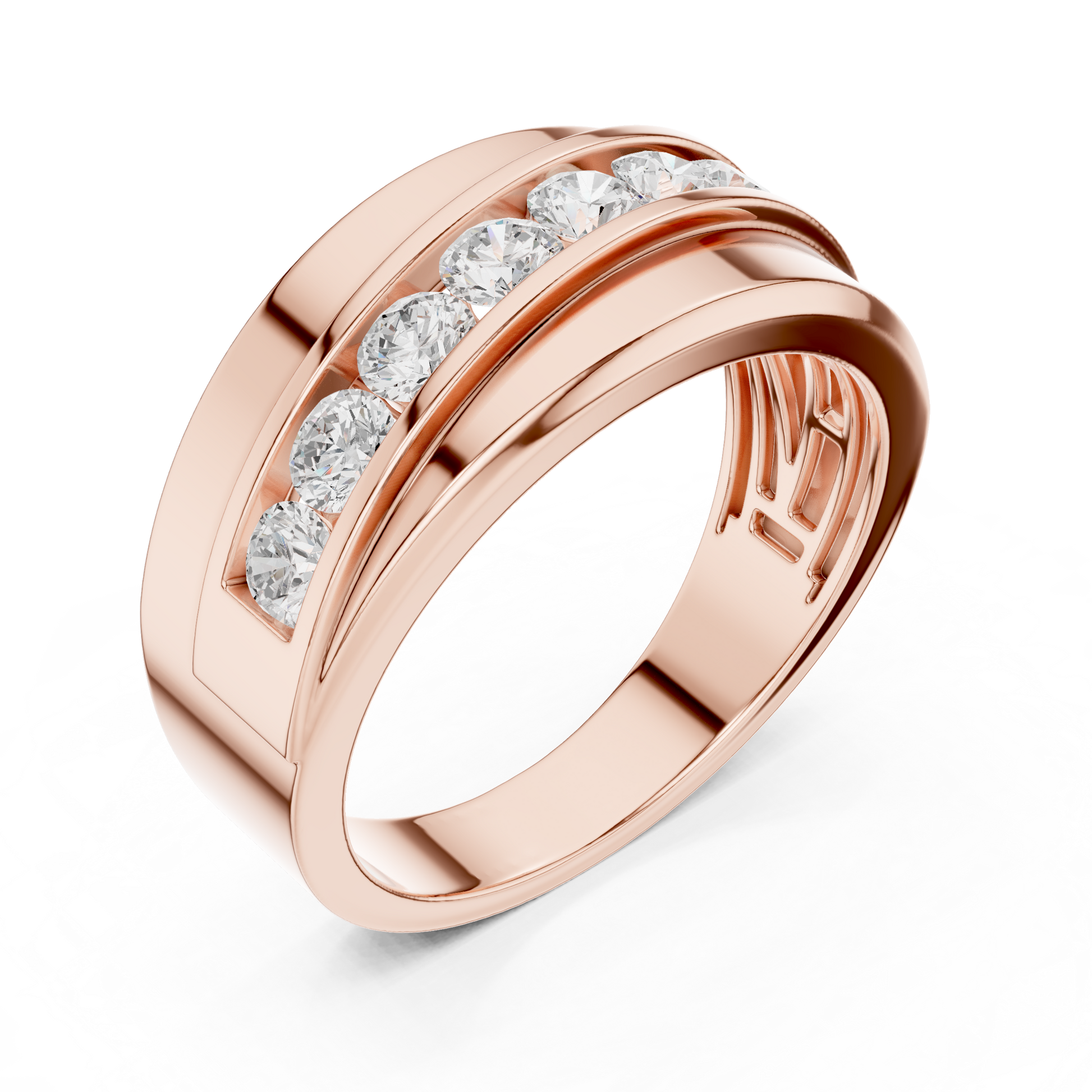 This alluring men’s broad band ring features seven sparkling diamonds set across a wide masculine band The bold yet refined design delivers strong presence and timeless elegance making it an ideal choice for a wedding band anniversary ring or statement everyday wear