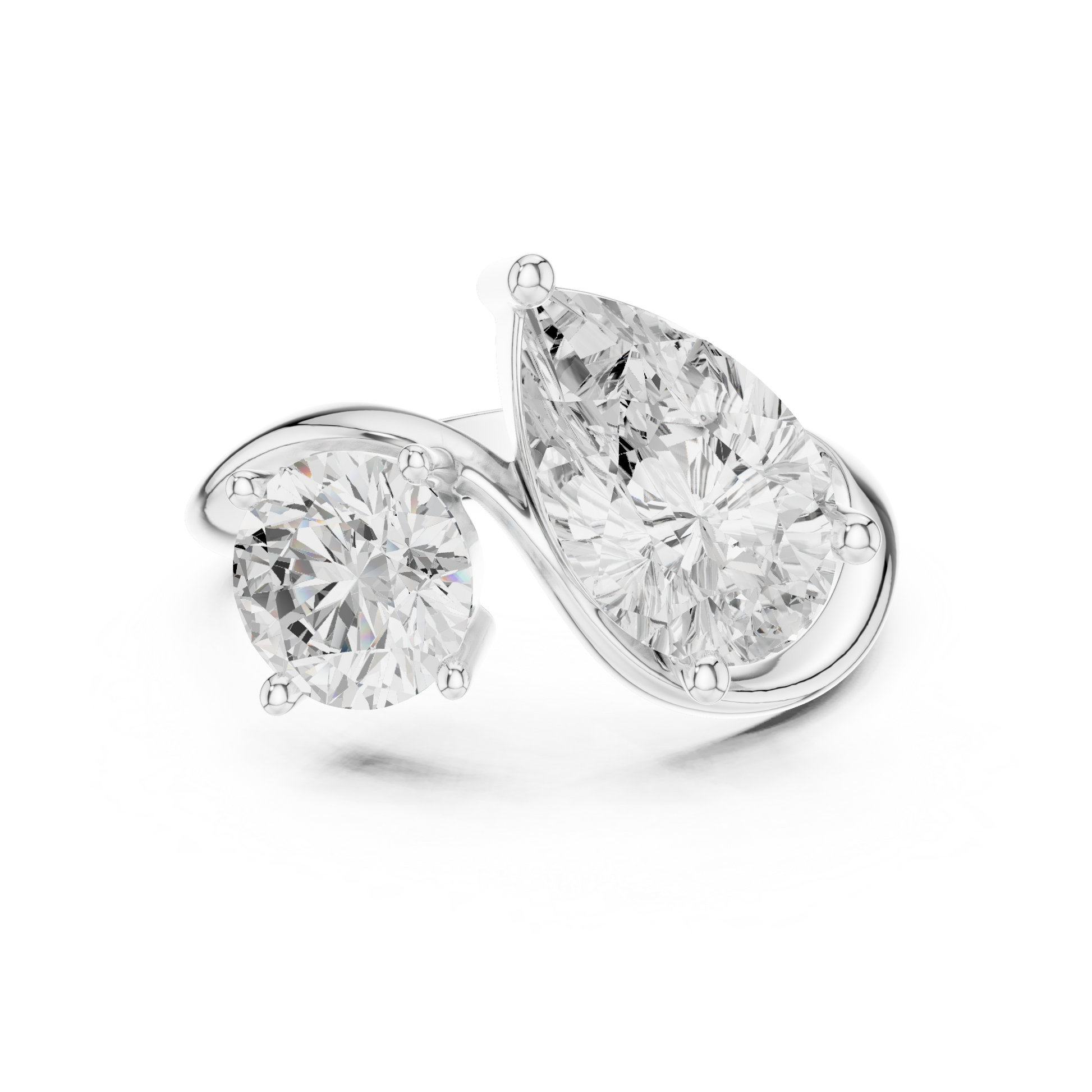 This elegant two-stone engagement ring features a round and pear-shaped diamond set on a gracefully curved intertwining band The design symbolizes unity and harmony creating a modern and timeless look perfect for engagements or special occasions