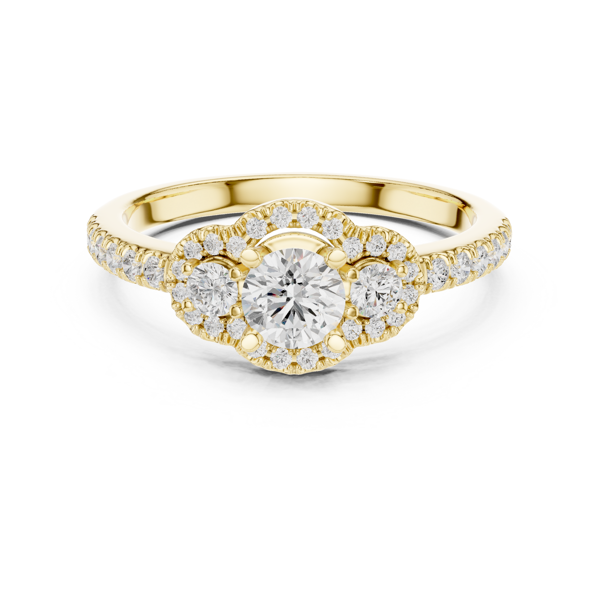 This stunning three-stone engagement ring features round-cut lab-grown diamonds at the center, accented by a delicate halo of pavé diamonds surrounding each stone for amplified sparkle. The three-stone design symbolizes past, present, and future, making it a meaningful and luxurious choice for engagements or milestone celebrations.